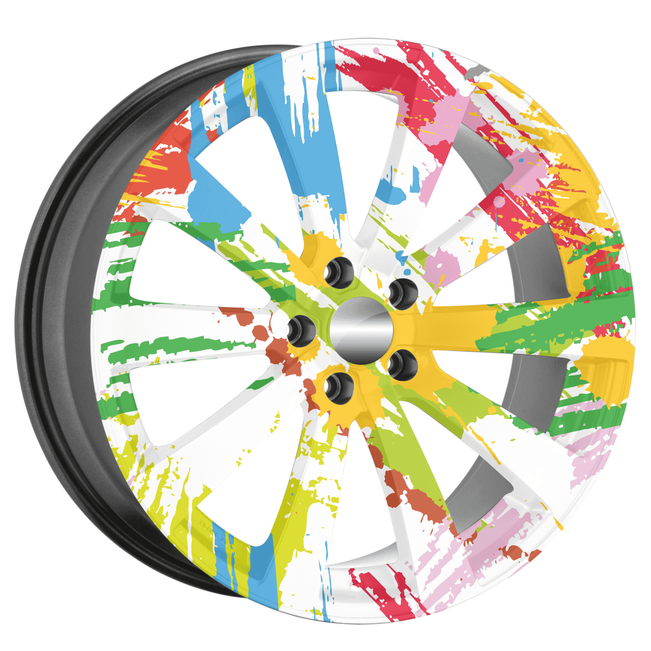 Folie colantare jante Ø60 cm cu design pictură abstractă multicoloră. Material OraJet, autoadeziv, rezistent UV, ideal pentru jante până la 21".