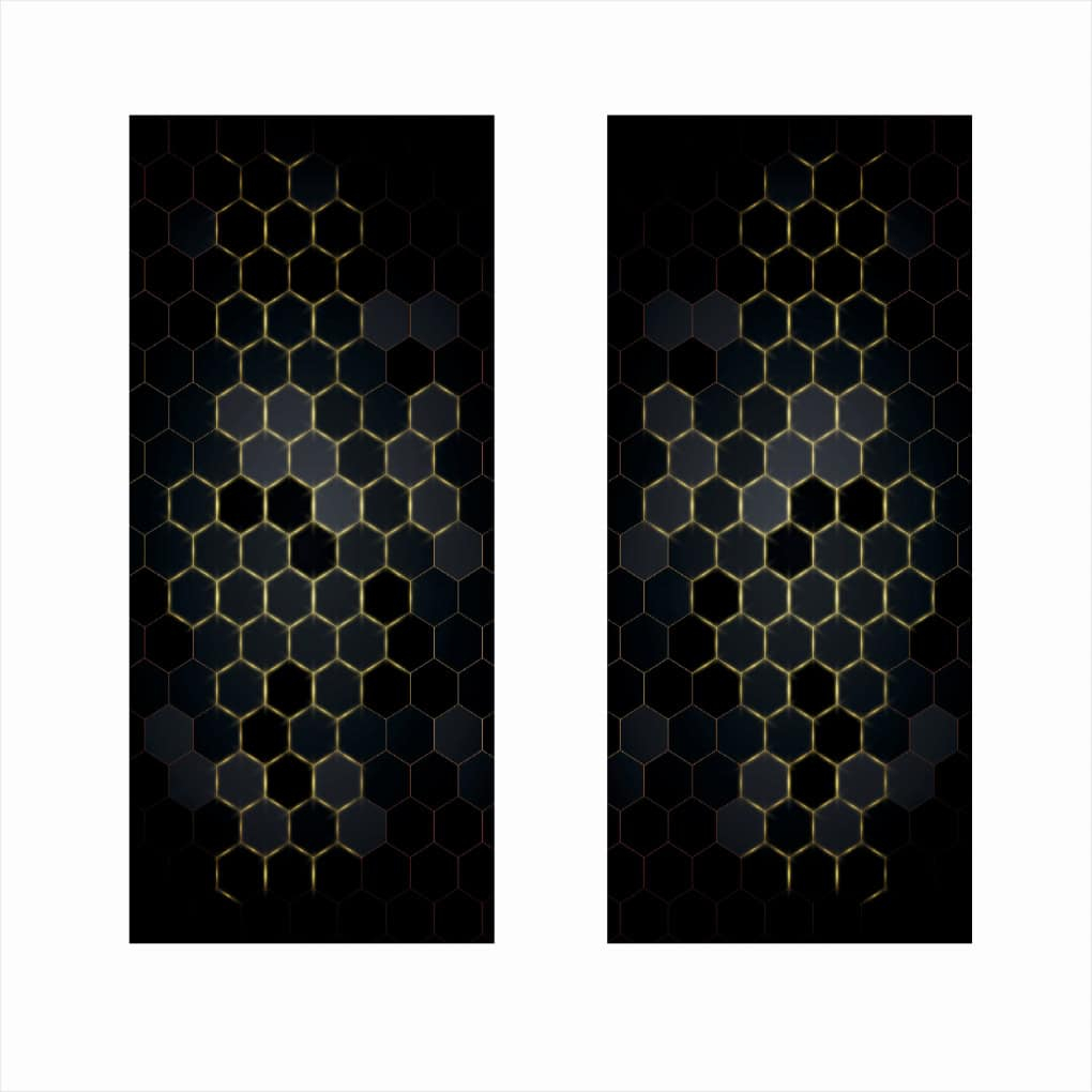 Stickere „HexaGold” pentru stâlpi ușă – model geometric tip fagure cu tonuri de negru, gri și margini aurii. Set 2 buc, 50x22 cm, print HD, autoadeziv.